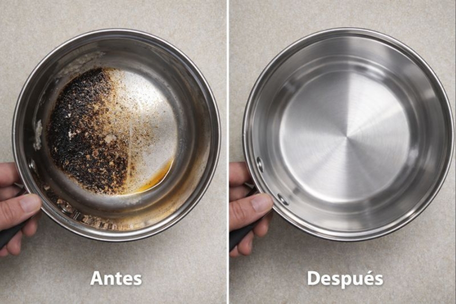 Cuando una olla se quema fuerte, el problema no es solo la suciedad: es la capa endurecida que se pega al metal.