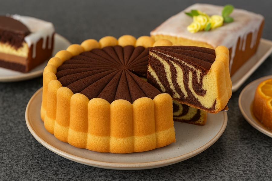 Cada uno tiene una textura distinta y un sabor que se luce por sí solo: un budín húmedo con glaseado fresco, una torta marmolada esponjosa, una torta de naranja invertida llena de aroma y una torta de chocolate con doble relleno.