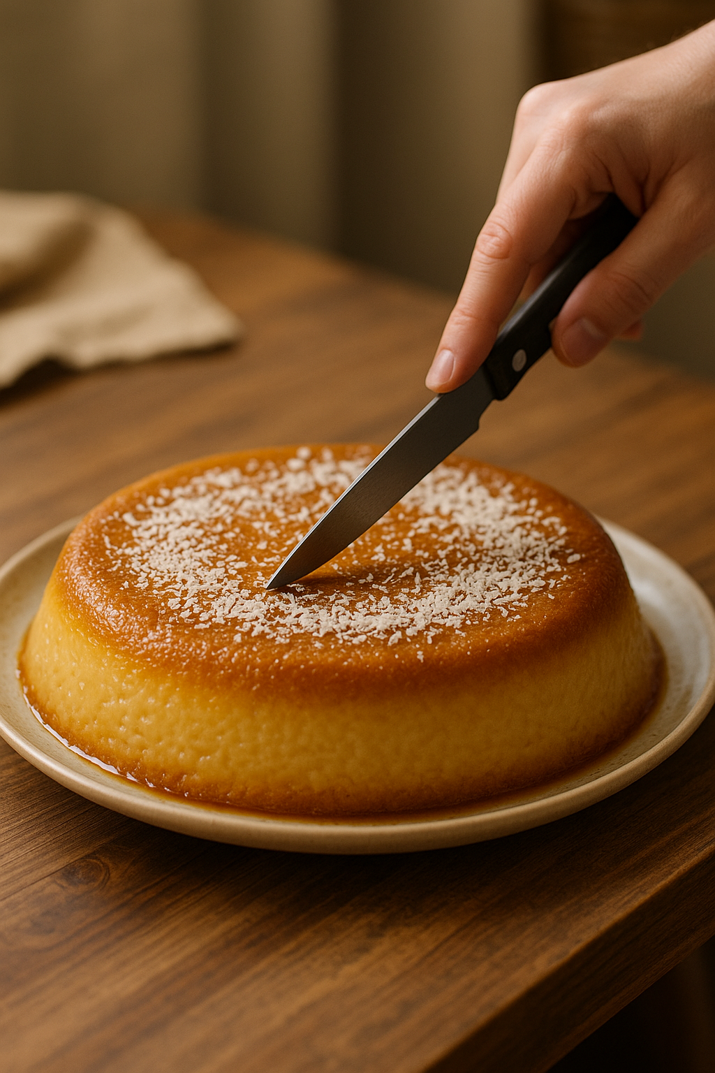 Una vez frío, desmoldá con cuidado sobre un plato. Espolvoreá coco rallado por encima o decorá con hilos de caramelo para un toque final más vistoso.