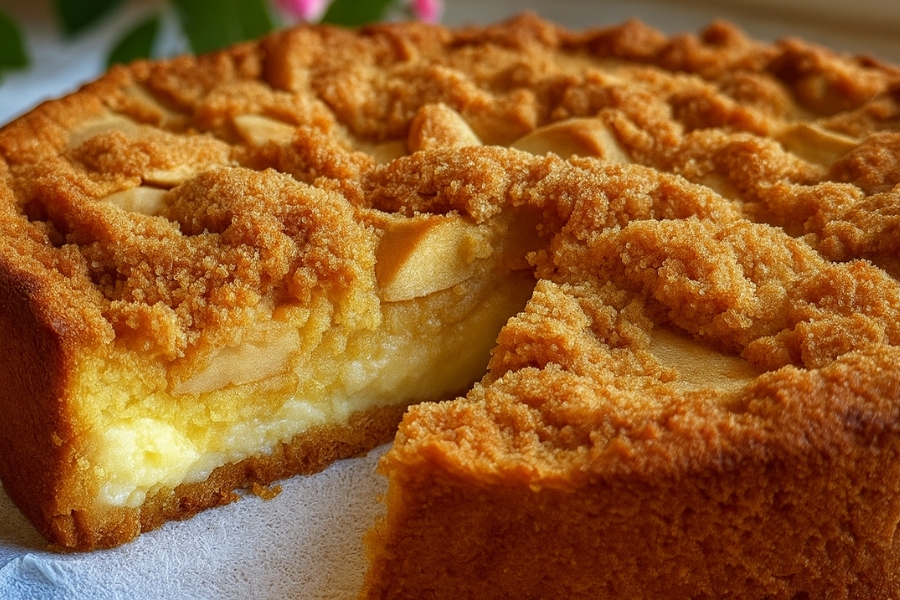 Esta tarta combina una base firme, un centro suave y una capa crujiente de manzanas con crumble dorado.