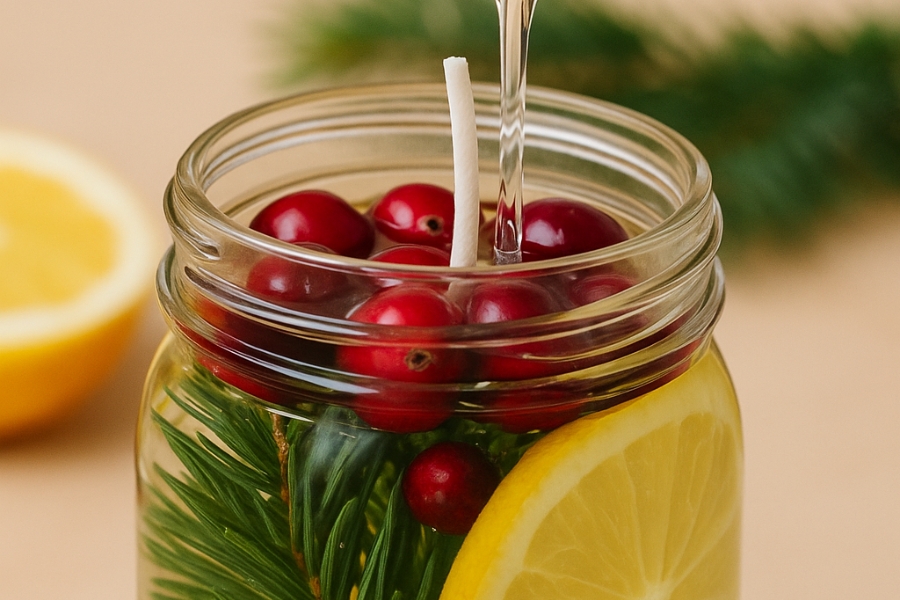 Estas velas combinan el brillo del aceite, la pureza del agua y los colores naturales de los adornos, creando una atmósfera cálida y mágica para las fiestas.