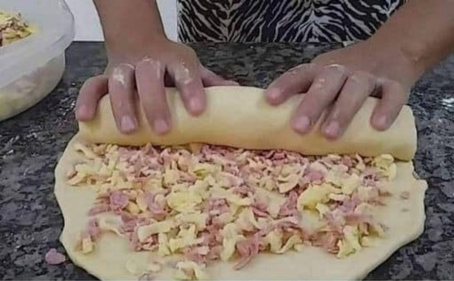 7. Enrollá la masa con cuidado, presionando suavemente para que el relleno quede compacto. Sellá los bordes para evitar que el relleno se salga al hornear.