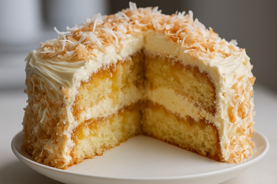 Este pastel esponjoso y húmedo combina capas de crema batida, mermelada y una cobertura de coco tostado que lo hace irresistible.