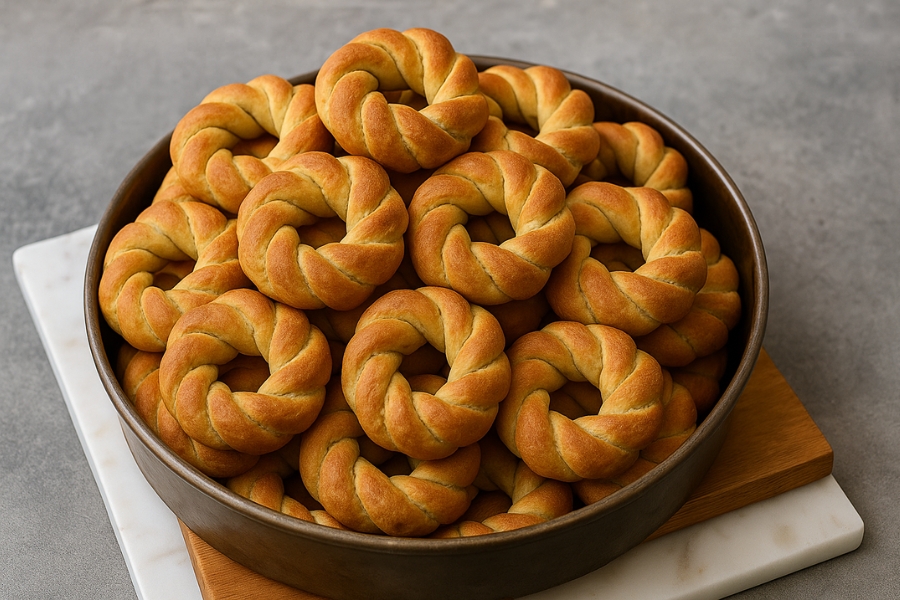 Dividí la masa en porciones pequeñas. Estirá cada una formando tiras y unilas en forma de aro o trenzalas si querés un toque decorativo.