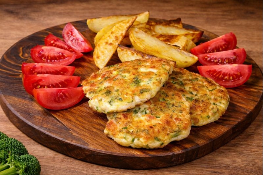 Estas tortitas de pollo quedan doradas por fuera, bien jugosas por dentro y se acompañan con papas al horno llenas de sabor.